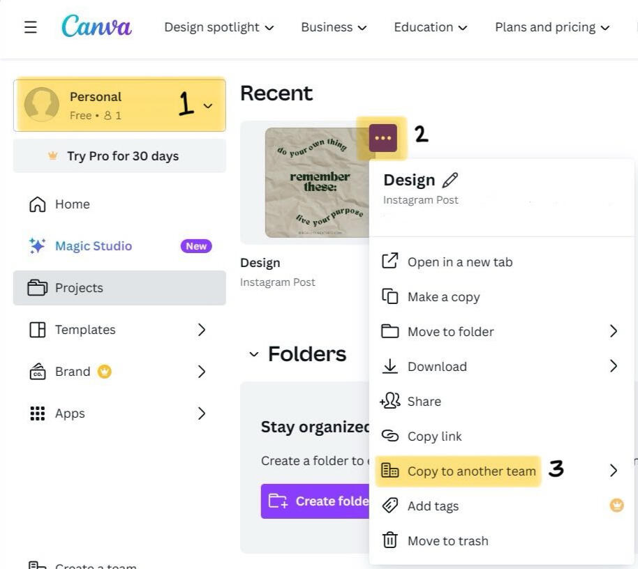 Ginagamit natin itong feature na ito kung may gusto tayong ilagay na Presentation na galing sa personal account natin papunta sa Canva Pro. Follow the steps provided below to copy your design from your Personal made presentation: